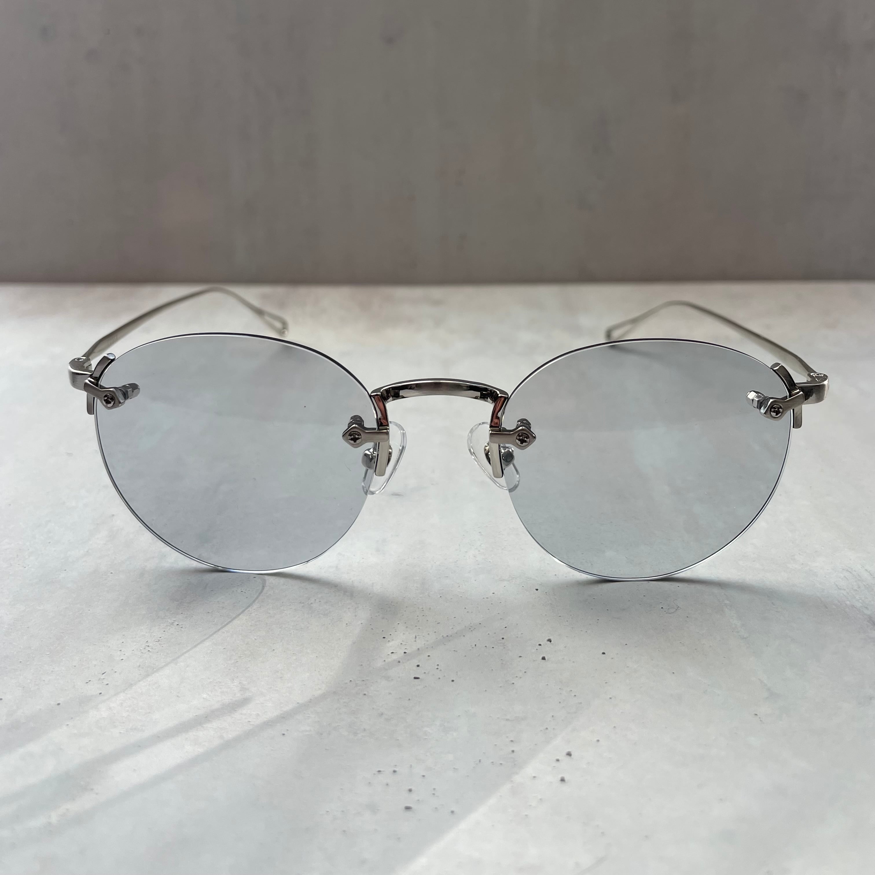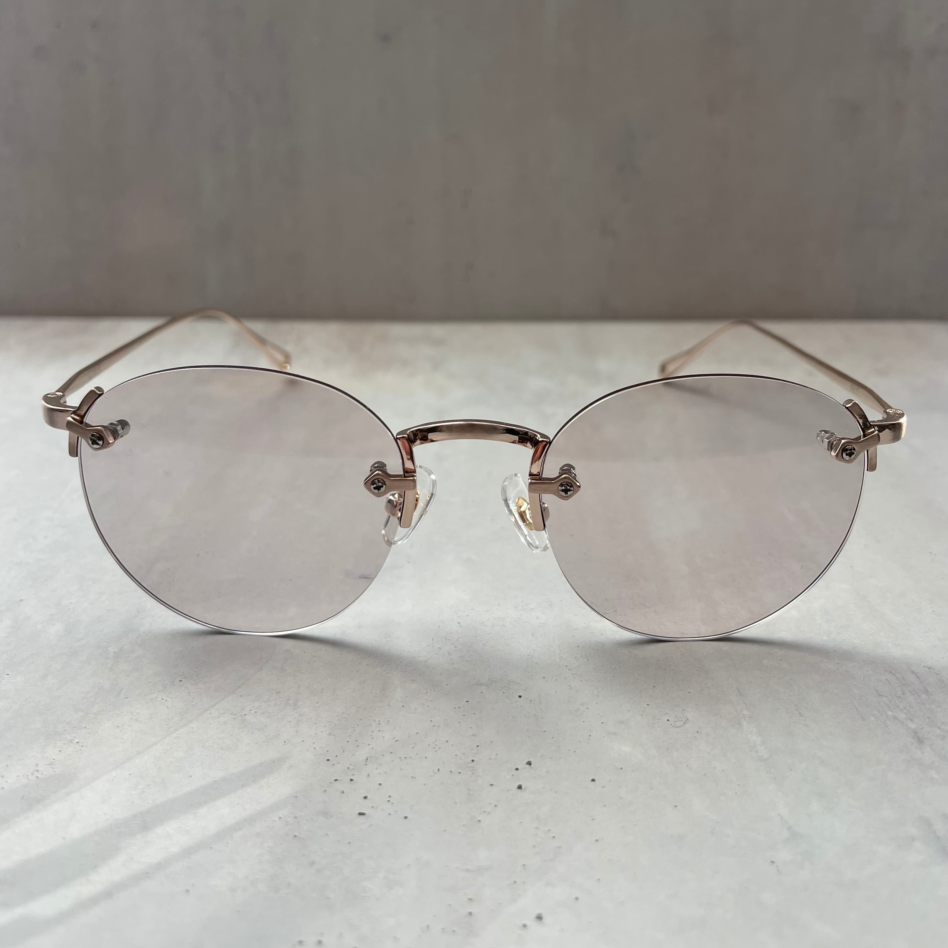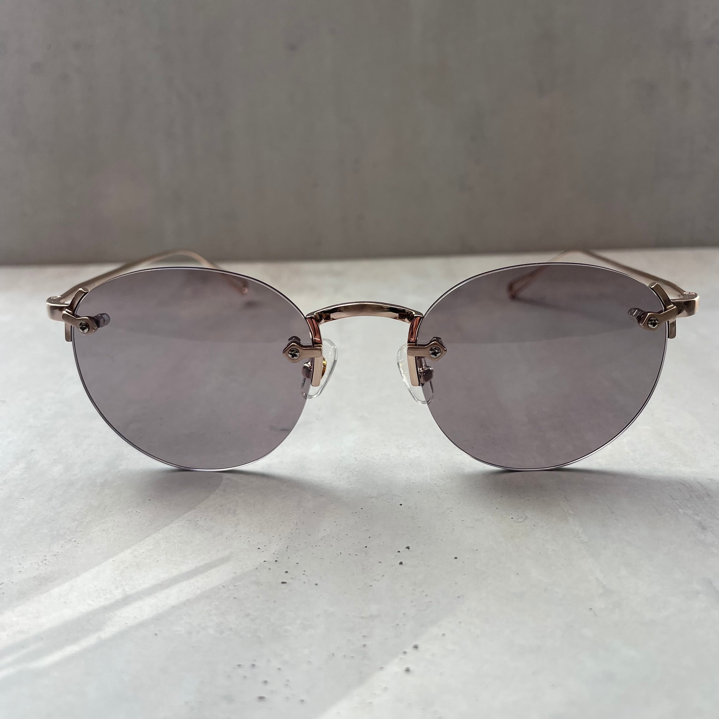 クラックの発生を少なくしたポリアミド樹脂のレンズを採用し、クラシックなレンズシェイプのリムレスフレームにオリジナルライトカラーレンズを合わせてモードな印象にもなるスタイルに仕上げた。