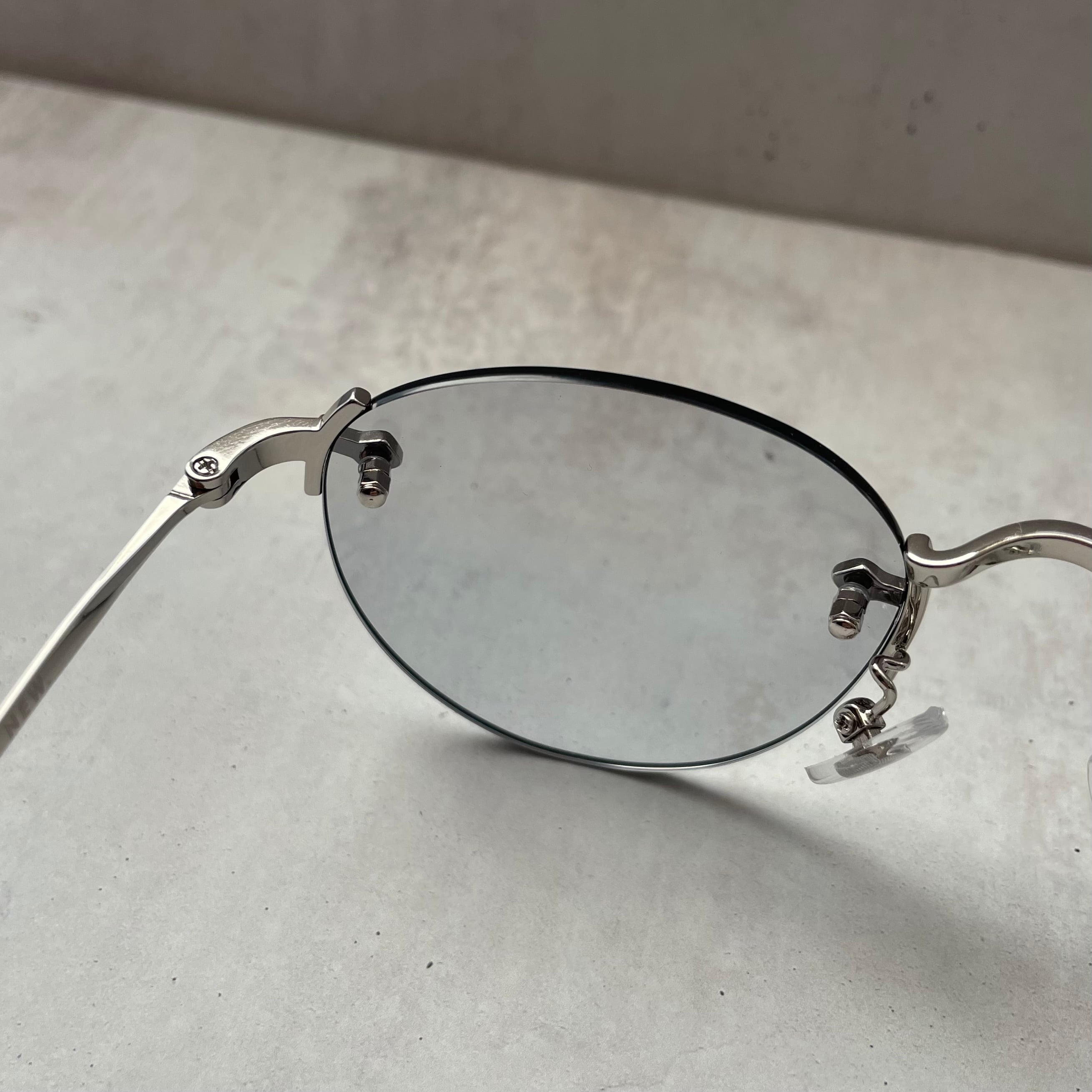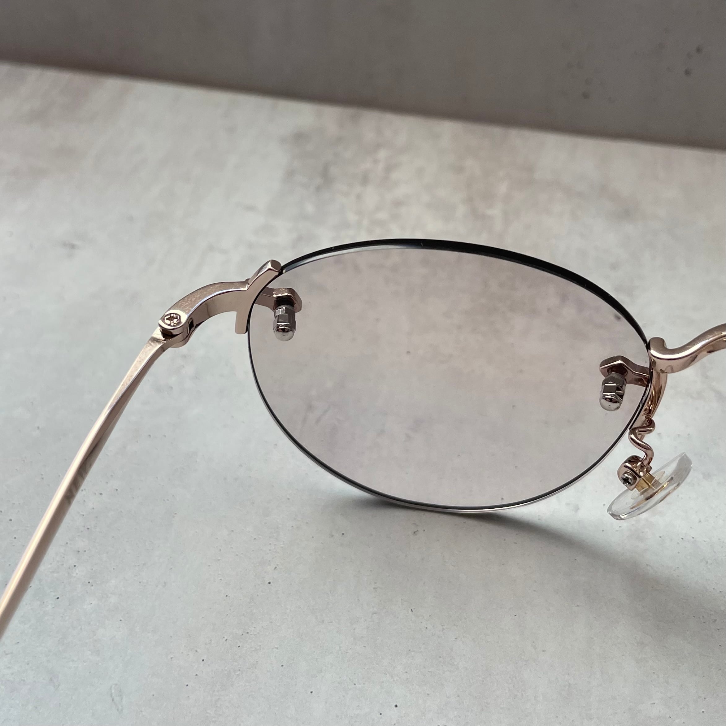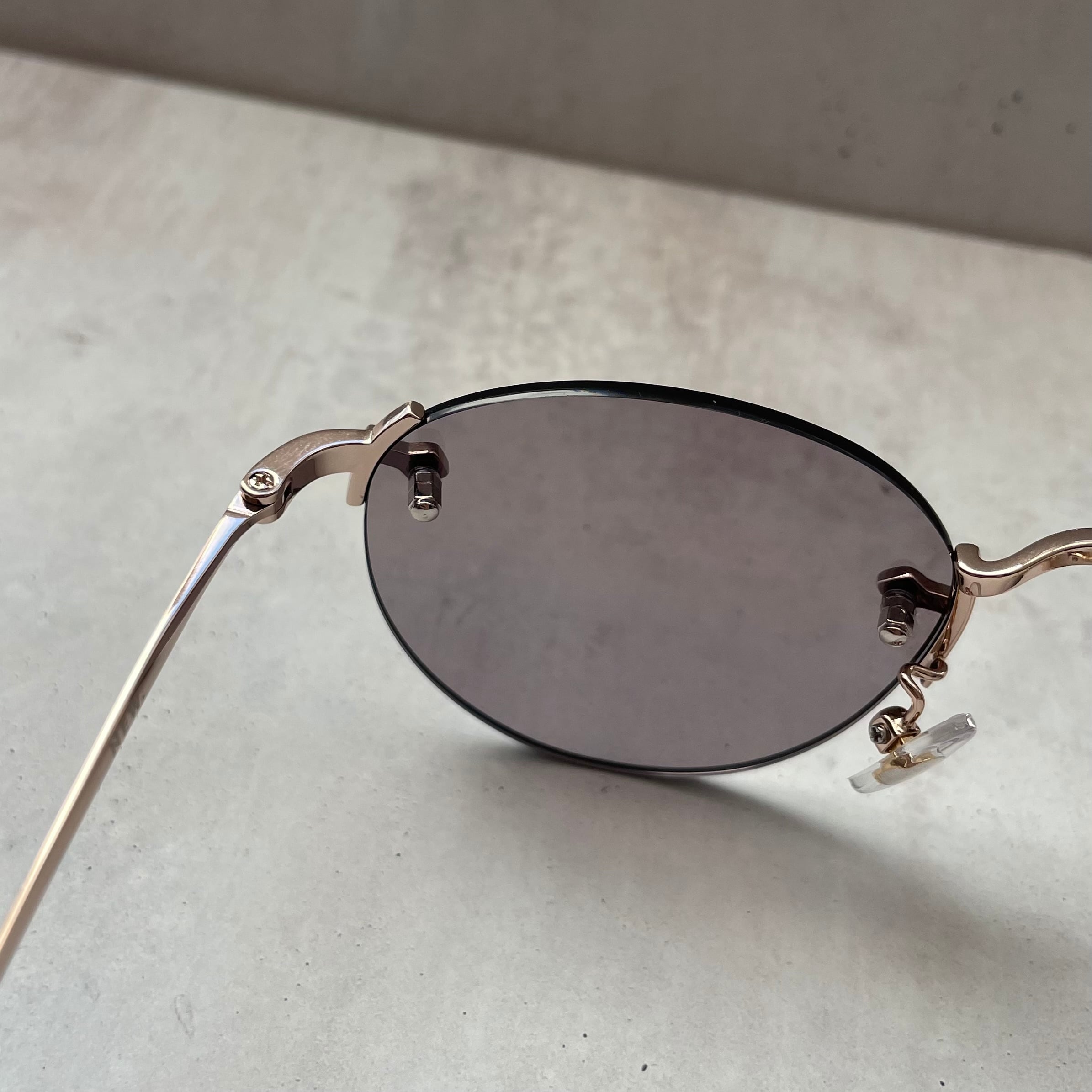 クラックの発生を少なくしたポリアミド樹脂のレンズを採用し、クラシックなレンズシェイプのリムレスフレームにオリジナルライトカラーレンズを合わせてモードな印象にもなるスタイルに仕上げた。